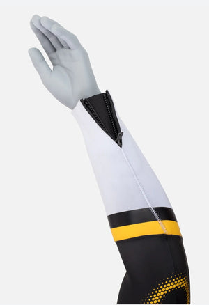 Las mangas del NORSEMAN 3.0 han sido completamente rediseñadas. La flexibilidad ha sido maximizada desde justo debajo del codo hasta el hombro mediante el uso de nuestro renombrado neopreno UltraFlex de 1,5 mm. Esta manga de UltraFlex de 1,5 mm se combina con nuestro nuevo antebrazo de propulsión. El antebrazo de propulsión consta de neopreno doble laminado recubierto de silicona de 5 mm que permite a un atleta capturar y tirar más agua que nunca. Se ha agregado una cremallera corta para facilitar el deslizamiento de los guantes del Polar Kit debajo del neopreno del antebrazo, reduciendo así la entrada de agua.